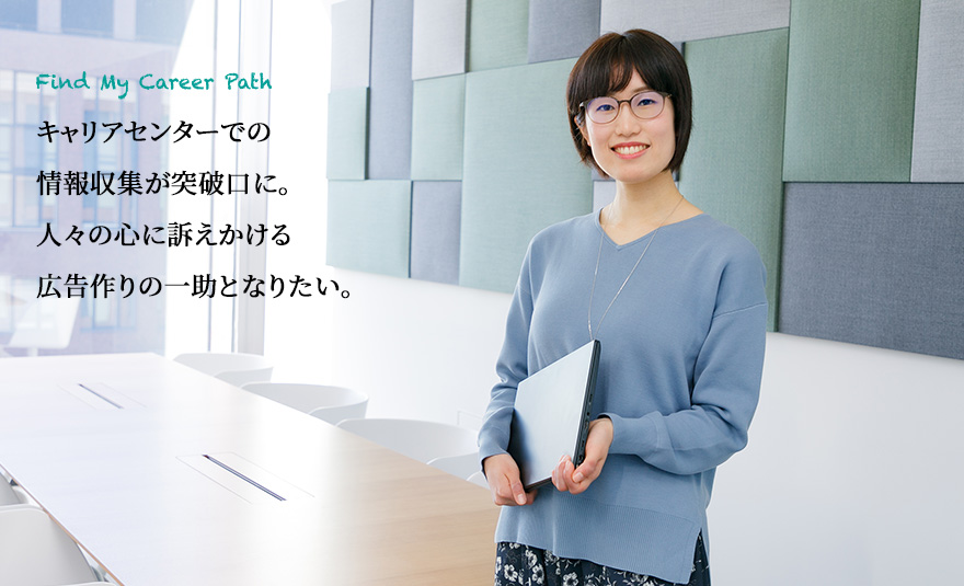 私の就職活動におけるターニングポイントとなったのは、キャリアセンターの個別相談です。初めて訪れた際にMUSES(※)の活用法を教わったことで、その後、キャリアカウンセラーの方が第一志望の企業を訪問されたという情報をキャッチできました。またそれを機に、広告業界に特化したエントリーシートの添削や面接の指導を受けることにつながりました。キャリアカウンセラーの方が、厳しさを持って的確に指摘してくださることもありがたかったです。アピールのために記載するエピソードの具体性や面接のシミュレーションなど、足りない部分をしっかり把握し、本番に備えることができました。