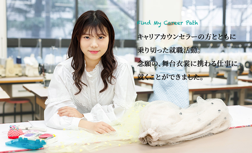 就職活動の軸だった「好きになれる仕事に就きたい」という思いがかない、春から舞台衣裳に携わります。私は3歳の時にバレエを始め、バレリーナとして舞台に立ってきました。また舞台鑑賞も好きで、劇団四季はもちろん、ブロードウェイも観に行ったほどです。自分の中にある舞台に対する思い入れと、2年間学んできた衣服制作に関わる専門的な知識・スキルが私の強み。就職活動に一生懸命に取り組むプロセスで得た自信を生かして、楽しみながらスキルアップを図り、人として成長していきたいです。