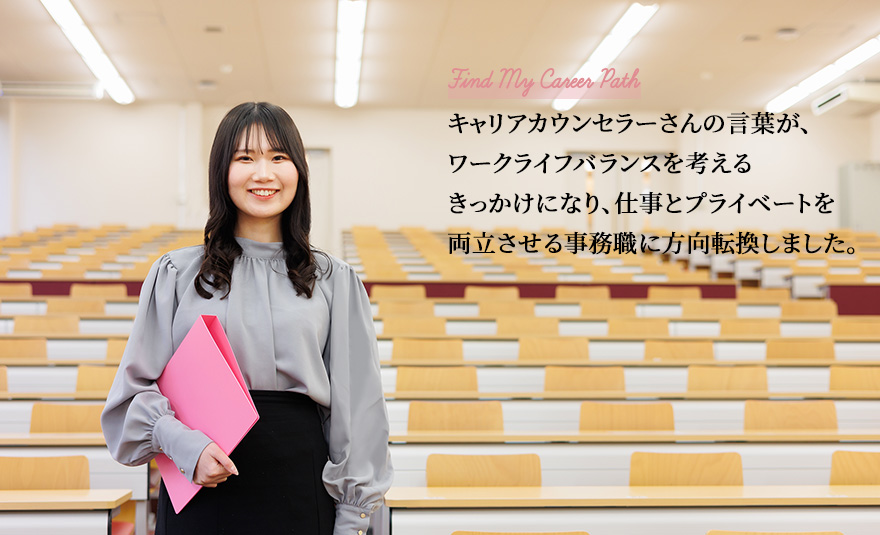 - そこから、本当にエンターテインメント業界で働きたいのか、自分に問い掛けるようになりました。迷っている私の背中を押してくれたのは、キャリアカウンセラーさんの「ワークライフバランス重視なら事務職」という言葉です。職種という切り口を提案していただいたことで視野が開け、自分の大切にしたいこと=軸に沿ってシフトチェンジするという選択をすることができました。どこへ進めば良いのかも分からず、まさに漂流しているような状況だった私の「プライベートを大事にしたい」という思いを理解した上で、一緒に考えてくださったことに感謝しています。