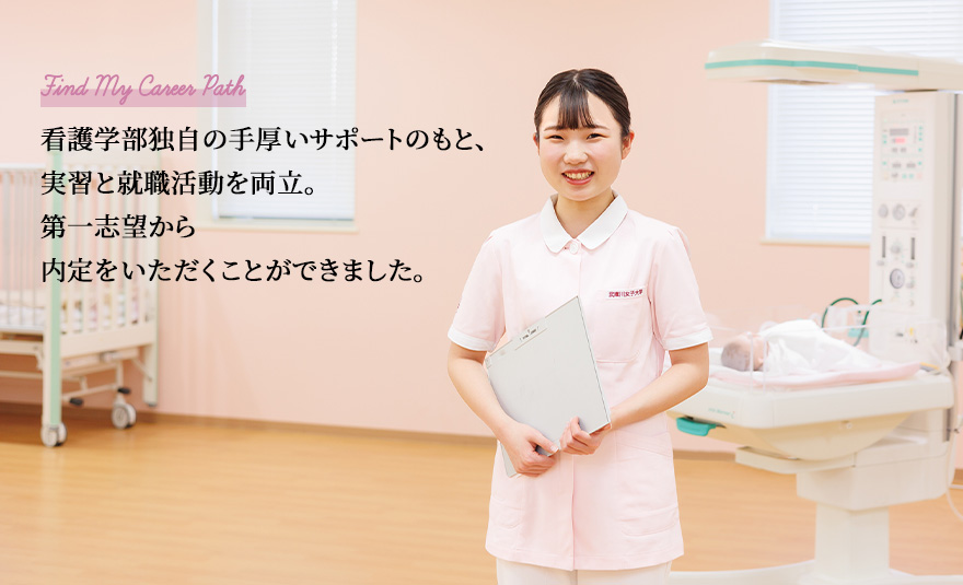 - 看護学部では独自のキャリアガイダンスが行われ、その中で、内定を得た先輩の体験談を聞く機会も設けられます。就職活動の基本的な流れ、病院の情報、履歴書の作成手順など、必要な知識・情報を確実に得ることができ、次第に意識が高まっていきました。3年生の3月に始めた就職活動で重視したのは、実習といかに両立するかということです。3月と5月に実習があったので、3月中は土日を活用して履歴書を作成しながら、実習のない4月に採用試験を実施する病院をピックアップし、第一志望を決定。先輩の話から予想はしていましたが、実習と就職活動が重なった時期はまさに怒涛の日々でした。
